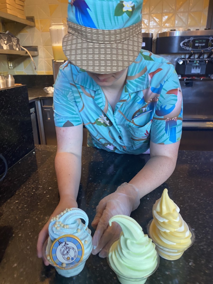 Our sweet server made our special Cinderella Dole whip and the Lime and Pineapple Swirl Dole Whips for us before we headed home. If you look closely, you can see the pretty edible glitter on the Cinderella Dole Whip!