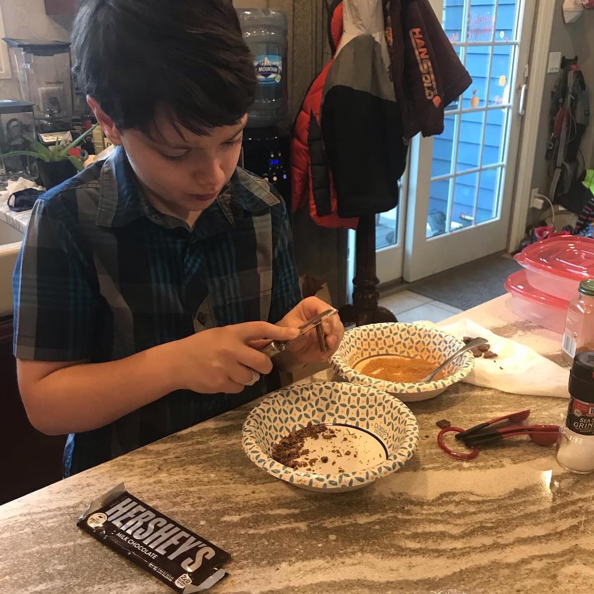 We didn’t have jimmies or sprinkles and my kids aren’t fans of them anyway, so we took a Hershey chocolate bar we had and used a carrot peeler to make chocolate shavings to roll the truffles in. My younger son also wanted to roll some into a mixture of cinnamon and sugar. It was a lot of fun, and they were very good. It was a great cooking project for the weekend.