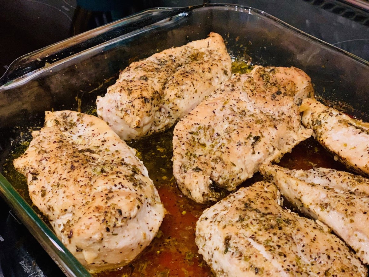 Next, lay the chicken breasts in a single layer with some spacing between them in the pan, then drizzle a couple of tablespoons of olive oil over them. Give them a couple turns each of sea salt and pepper from the grinders, then give a light sprinkle of garlic salt to taste. Next, give a generous sprinkling of Italian seasoning, and place in the oven for 45 minutes, flipping the breasts halfway through.