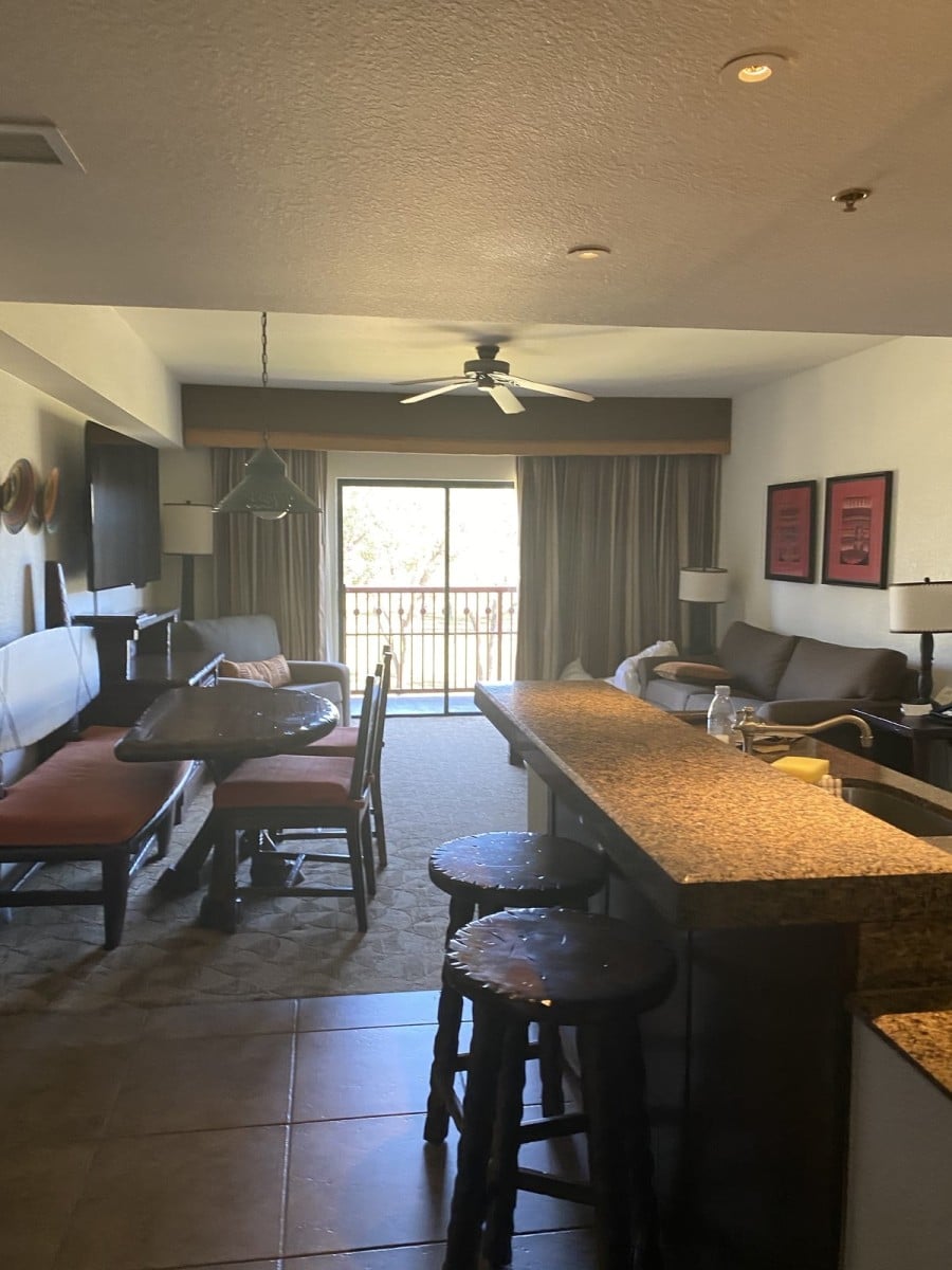 During this stay at Animal Kingdom Lodge Kidani Village, we had a 1 bedroom villa. Animal Kingdom Lodge Villas have 2 bathrooms, even in their 1 bedroom rooms. This was awesome since we had 2 boys and our Michigan Grandma staying there with us. In the bedroom, there is a King bed, a side chair, nightstands, and an amazing bathroom. The bathroom has a deep soaker tub. I have pain issues, so I love when we have a nice big bathtub on vacation. It’s so nice when we are at the parks all day to be able to come back and soak away the soreness and fatigue in the jacuzzi tub. My husband thinks the shower in the bathrooms are cool too. In the 2nd bathroom off of the living room, there is a standard tub shower combo that is perfect for our kids. I love that they also have a washer and drier in the DVC rooms. We drive from Wisconsin, so by the time we get to Disney, it’s always nice to be able to do some laundry. The living room has a queen pullout couch and pullout chair. If you don’t find these comfortable enough, you can ask the front desk for a memory foam topper. Grandma chose to sleep in the pullout chair and was fine the first night but she needed the memory foam after that. She mentioned it to the front desk, and a short time later, Mousekeeping arrived and put the memory foam topper on the pullout chair for her. She slept great after that.